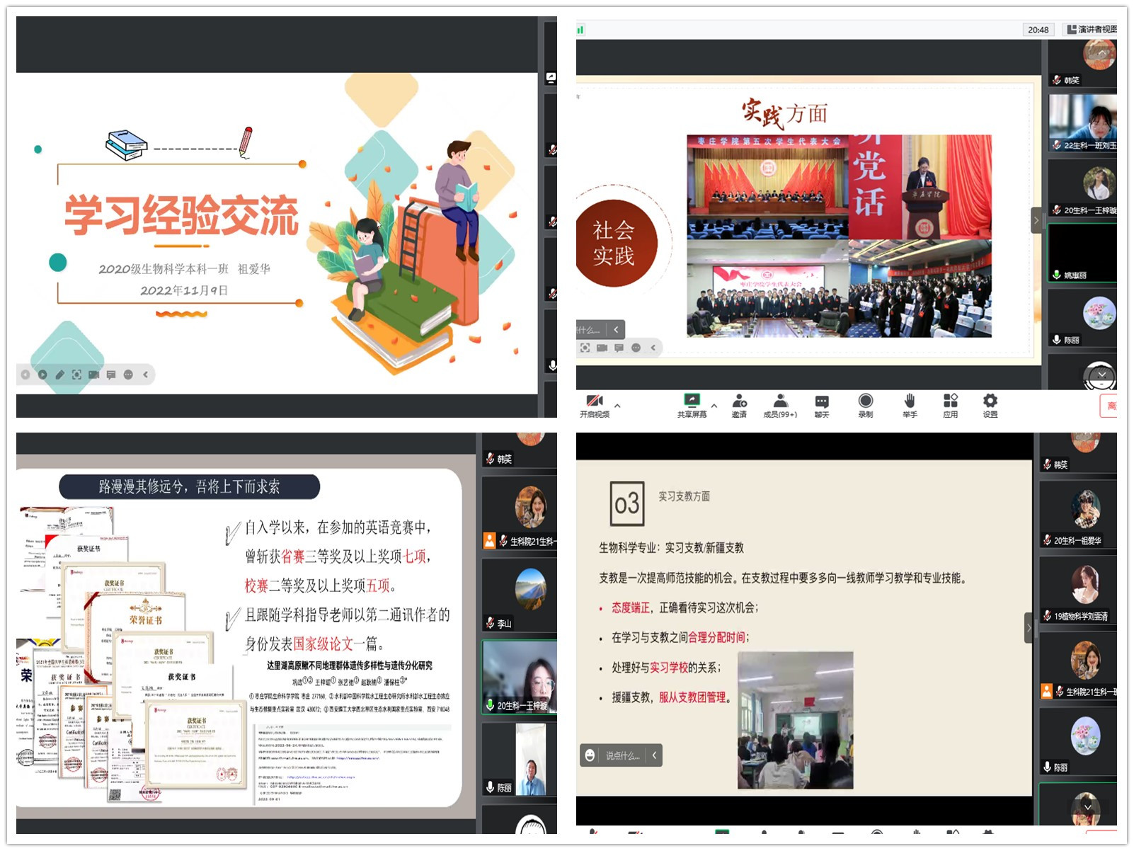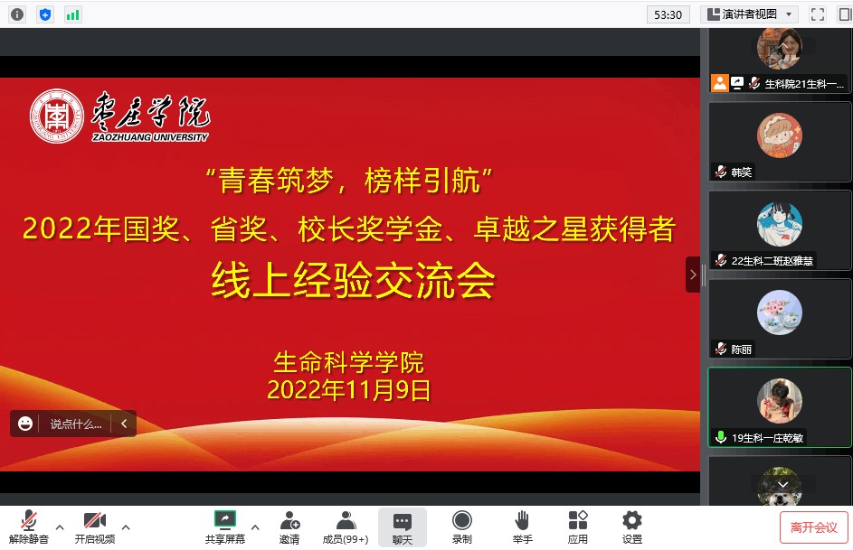 11月9日,生命科学学院举行“青春筑梦、榜样引航”奖学金获奖学生线上经验交流会,充分发挥优秀学生先进榜样的示范引领、朋辈激励作用,持续推动学院学风建设。