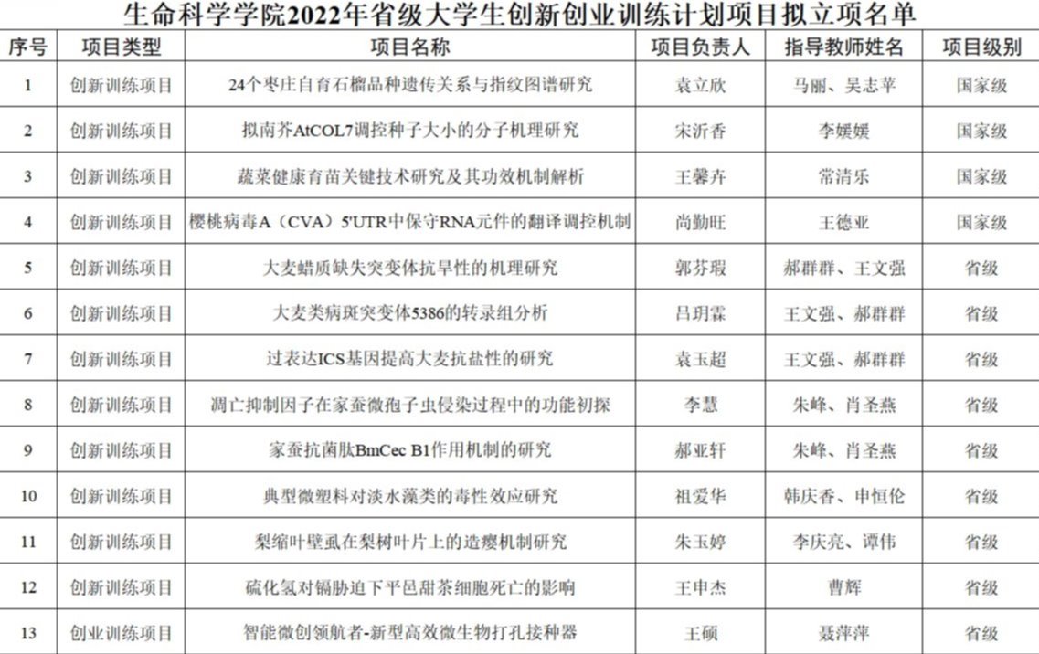 生命科学学院高度重视创新创业训练计划的立项工作,组织专题工作推进会,精心组织、广泛发动,扎实做好创新创业人才储备和项目发掘转化工作。学院36名教师和8名校企合作工程师指导19级、20级、21级本科生成立了58个申报团队,并对申报项目进行了深入研讨和论证。经学院组织专家评审,推荐58个项目参评校级评审,其中40项成功获批校级立项,并由学校推荐至省教育厅参评国家级和省级立项,最终4项获批国家级立项、9项获批省级立项。