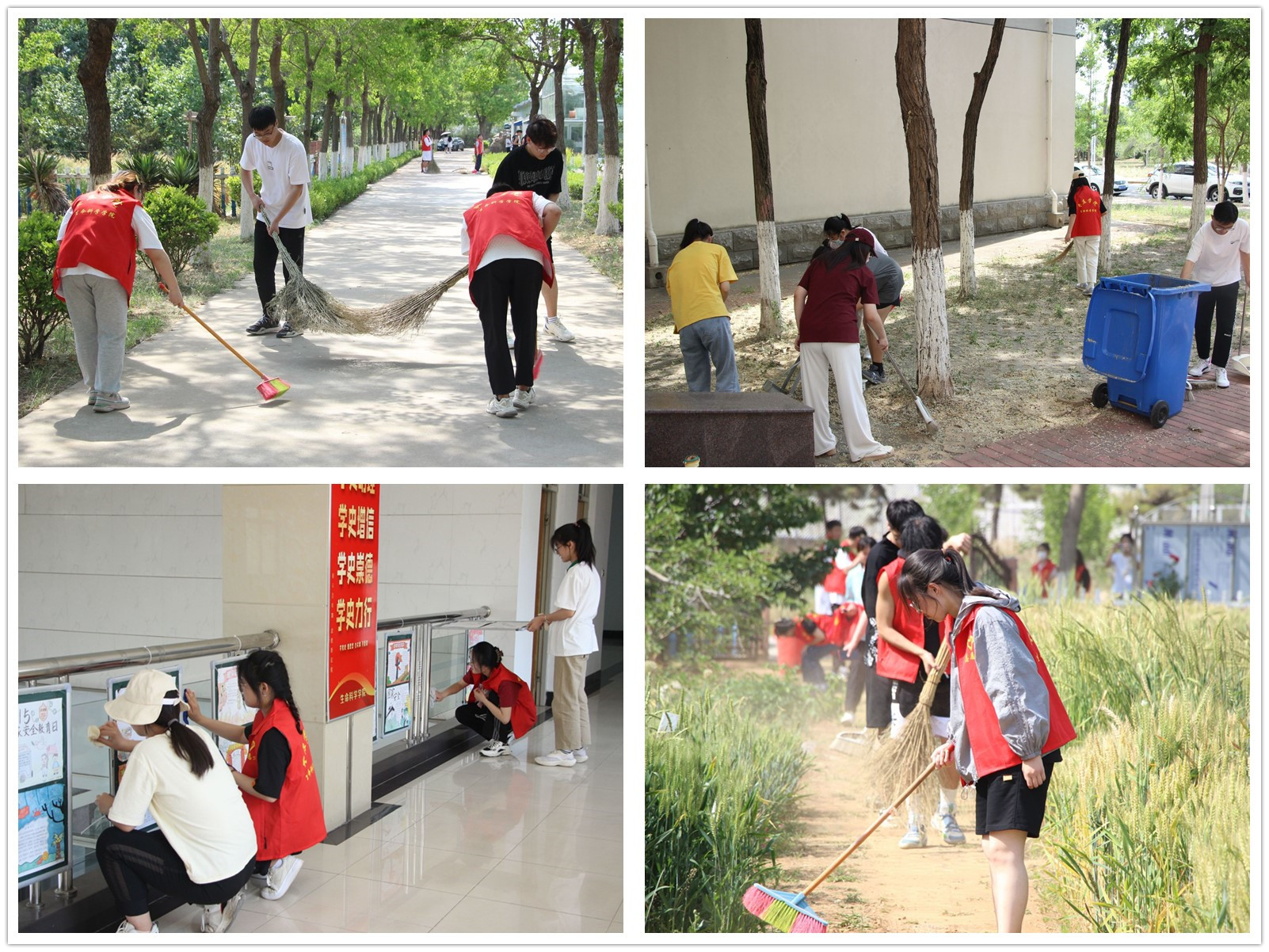 此次活动以学院环境卫生治理为主要内容,对教学楼、实验楼、宿舍楼、生物园地等开展卫生扫除。同学们合理分工,密切合作,手拿扫帚、拖把、簸箕等工具,对地面、墙壁、划分区域绿化带等进行认真清理,有的拖地擦玻璃,有的喷洒消毒,有的打扫落叶,还有的清理卫生死角垃圾……经过大家的共同努力,校园面貌焕然一新。