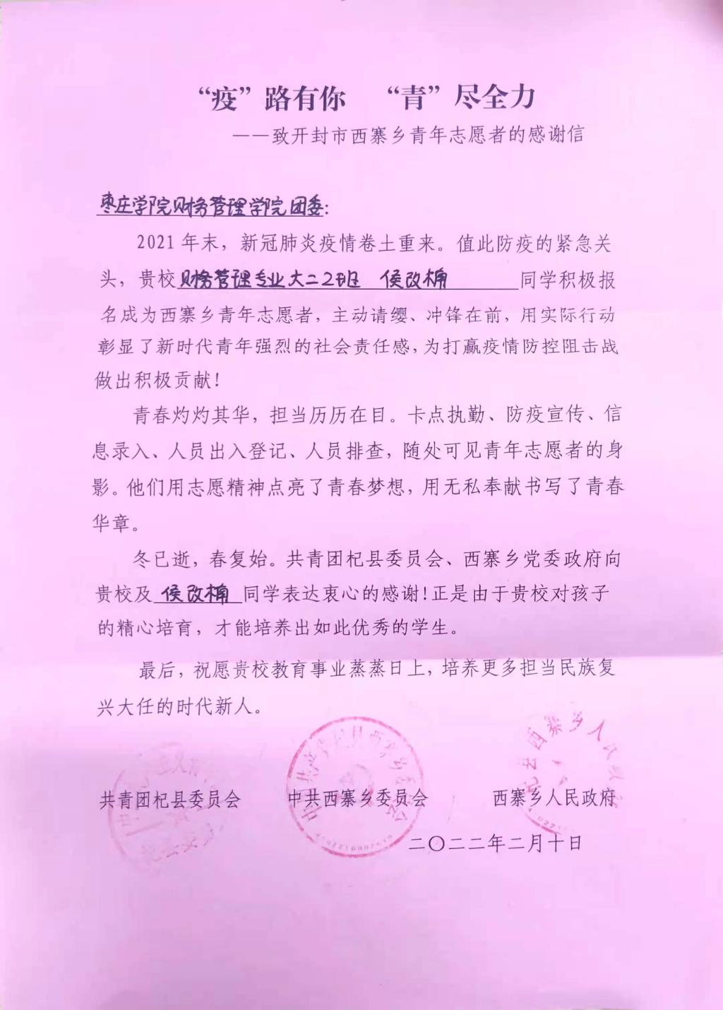 疫情尚未散去,人心不曾远离。近日,经济与管理学院收到来自共青团杞县委员会、中共西寨乡委员会和西寨乡人民政府的感谢信,信中对LETOU官网经济与管理学院2021级财务管理升本二班学生侯改楠参与疫情防控的事迹予以了表扬,同时对学校教育事业和人才培养工作表达了期望。
