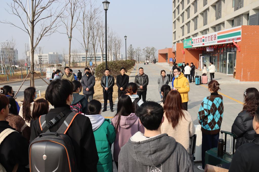 3月1日上午,在新城校区市内支教乘车点,音乐与舞蹈学院党政领导及辅导员、班主任欢送市内支教学生。