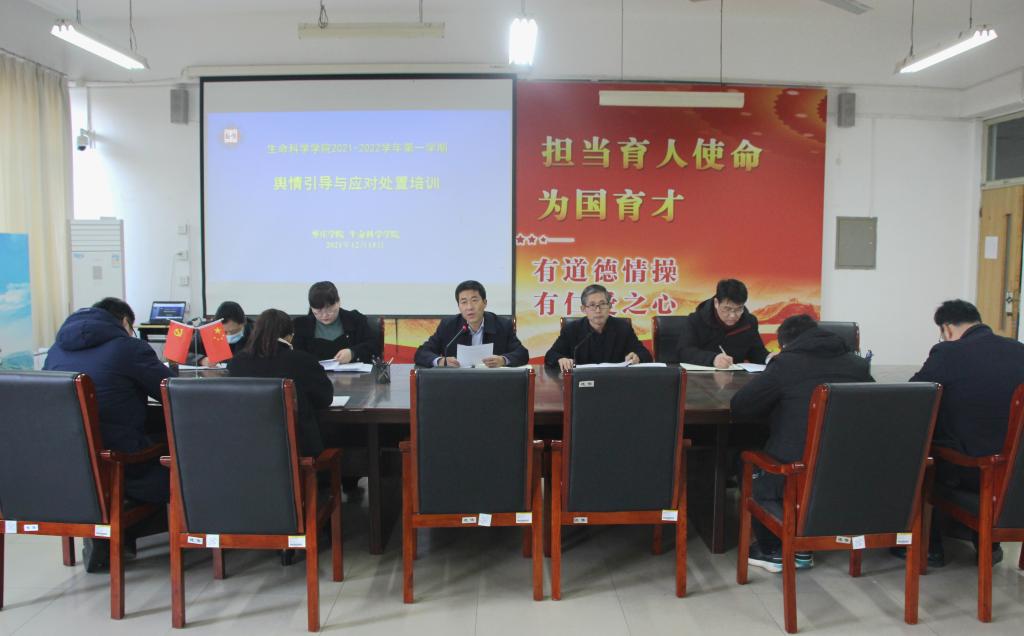 为加强学院宣传思想队伍建设,提高师生应对网络舆情的处置能力,进一步筑牢网络宣传和意识形态主阵地,12月16日下午,生命科学学院在2220会议室面向全体教师召开“舆情引导与应对处置”专题培训。会议由党总支书记郭传鑫主持。