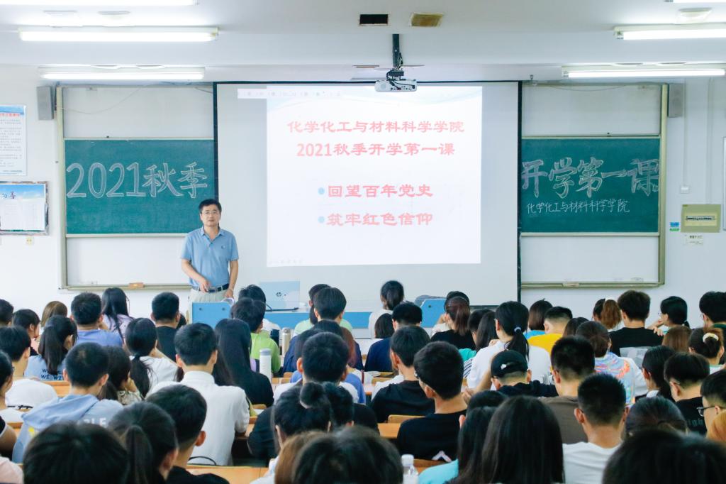 为深入推进党史学习教育,切实做好思想政治工作,8月30日下午,化学化工与材料科学学院2021年秋季开学思想政治教育第一课开讲。学院党总支副书记艾衍辉为学生讲授《回望百年党史,筑牢红色信仰》。