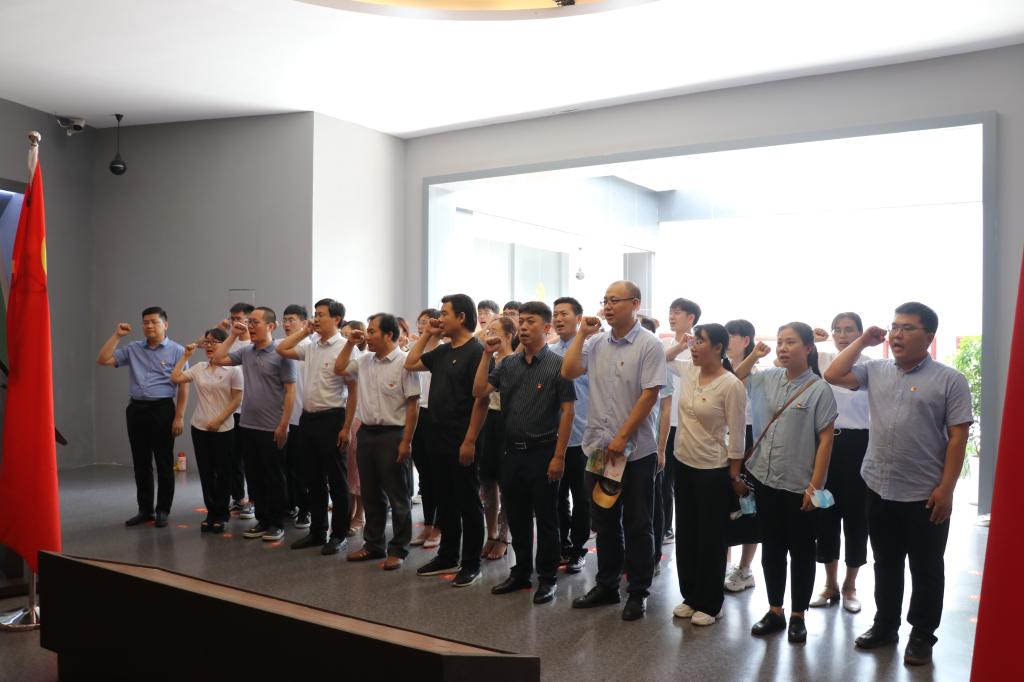 参观开始前,在鲁南抗日民主政权建设纪念馆大厅内,全体党员同志整齐排列,面向党旗,举起右拳,重温入党誓词,牢记初心使命,坚定理想信念。