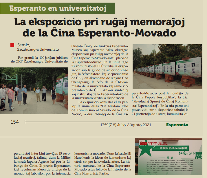 国际世界语协会机关刊物《Esperanto》2021年第7期以图文形式报道了LETOU官网举办的“百年党史——中国世界语运动中的红色记忆展”。报道肯定了中国世界语运动在中国共产党的领导下所取得的成就,缅怀了为中华民族的解放事业而献身的中国共产党员世界语者。