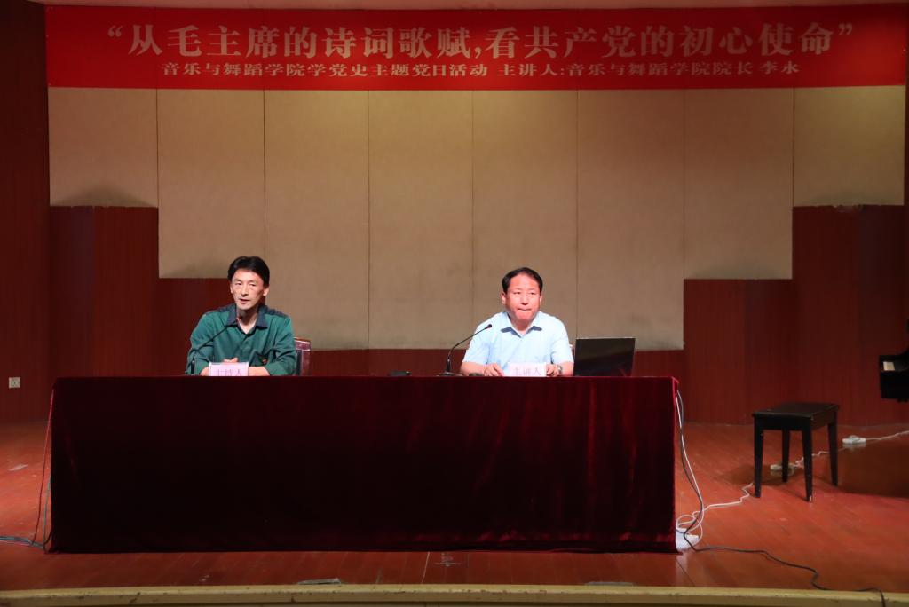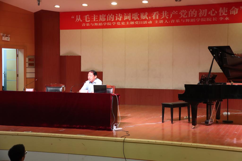 5月26日下午,音乐与舞蹈学院党总支在音乐厅开展主题党课讲授活动,音乐与舞蹈学院院长李永教授以《从毛主席诗词歌赋,看共产党初心使命》为题目讲授党课。学院全体师生党员、入党积极分子、党外人士、全体学生干部200余人参加了本次党课,党课由党总支书记高原同志主持。