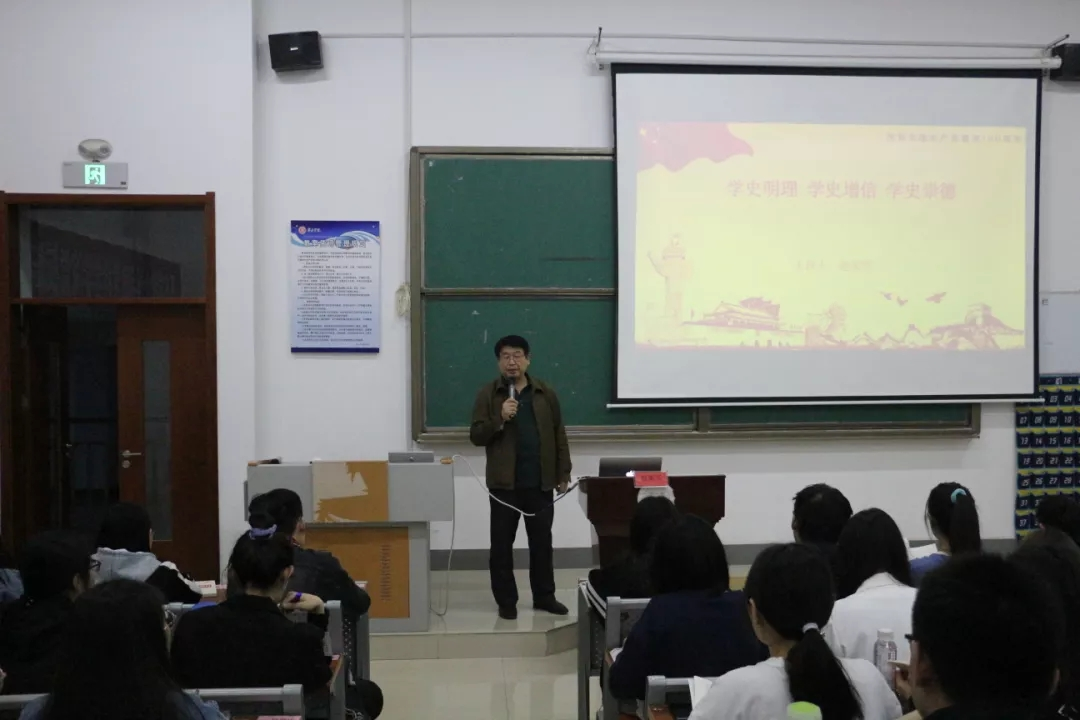 赵荣军从党史发展脉络及学习意义、新民主主义革命时期、社会主义革命和建设时期、改革开放和社会主义现代化建设新时代四个部分展开讲述,以中国共产党全国代表大会为线索,以时间为脉络,全面解读了党的百年光辉历程,为同学们上了一堂生动的党史教育课。