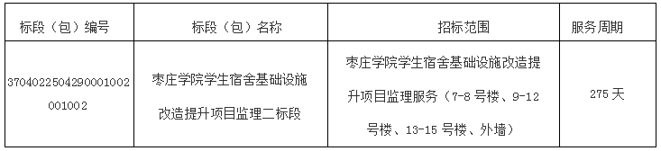 1.本次招标项目的建设地点:山东省枣庄市市中区北安路1号,LETOU国际米兰官网市中校区内。 2.工程规模:本项目为宿舍基础设施改造提升项目,工程项目费用9432万元,包括市中校区的4-15号共计12栋学生宿舍修缮,总建筑面积87878㎡,主要进行屋面防水改造、外墙修缮、封闭阳台、内外门窗更换、楼地面面层更新、内墙面层更新、吊顶更新、卫生间器具和排水设施更新、公共洗浴间整体修缮、供暖设备更换、消防系统改造、配电室电气线路更新及智能化改造等;同时进行室外工程修缮改造,主要包括重新敷设更换4-15号宿舍楼给水系统,改造为其服务的供暖锅炉房和化粪池,重做学生宿舍周边道路、铺装和绿化,划分监理管理标段一预估约4499万元,标段二预估约4933万元。