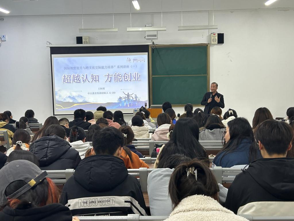 王怀周结合自身学习和海外创业经验,讲述了自己拓展视野、超越认知,不断创新创业的经历,向同学们阐述了为什么要创业,做人优秀与创业成功的辩证关系以及创业者所需要的一系列综合素养。他指出,创新是推动社会进步和经济发展的关键力量,而创业则是实现创新的实践者和推动者,创业不仅仅是追求个人成功和财富,更是一种生命体验,是实现梦想和创造价值的方式。他强调,上大学不是人生的目标,而是梦想的起点。他告诫同学们,要胸怀诗与远方,勇于尝试和探索,积极培养自己的创新思维和创业素养,为未来人生打下坚实的基础。