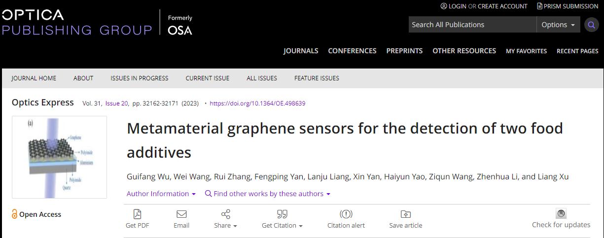 近日,山东省太赫兹科学技术及应用创新团队梁兰菊教授课题组设计了一种太赫兹生物传感器,实现对苏丹红、牛磺酸两种食品添加剂进行探测。研究成果以“Metamaterial graphene sensors for thedetection of two food additives”为题发表在Optics Express。