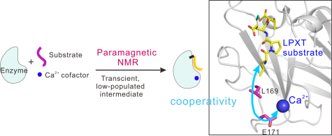 鉴于此,化学生物学团队陈家良博士与南开大学元素有机化学国家重点实验室苏循成教授以金黄色葡萄球菌分类酶sortase A(SrtA)为例,发展了结合位点特异性顺磁标记技术和选择性同位素标记方法解析短寿命酶催化中间体复合物结构的策略。该工作测定得到了溶液中分类酶SrtA在酶催化反应过程中不稳定的瞬时硫酯中间体复合物结构,阐释了SrtA与底物之间识别特异性的机理以及辅因子Ca2+在底物识别和催化过程中的协同作用机制(下图)。该方法有望应用于多种蛋白酶瞬态中间体的结构解析,进一步加深对蛋白制机器的底物识别机制与催化反应机理的理解。