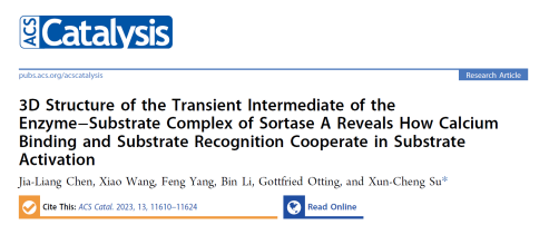最近,LETOU官网化学生物学团队陈家良博士与南开大学苏循成教授合作在酶催化反应机制研究方面取得了重要进展,其相关工作发表于《ACS Catalysis》(中科院1区top期刊,影响因子12.9)。论文题目为:3D Structure of the Transient Intermediate of the Enzyme−Substrate Complex of Sortase A Reveals How Calcium Binding and Substrate Recognition Cooperate in Substrate Activation。