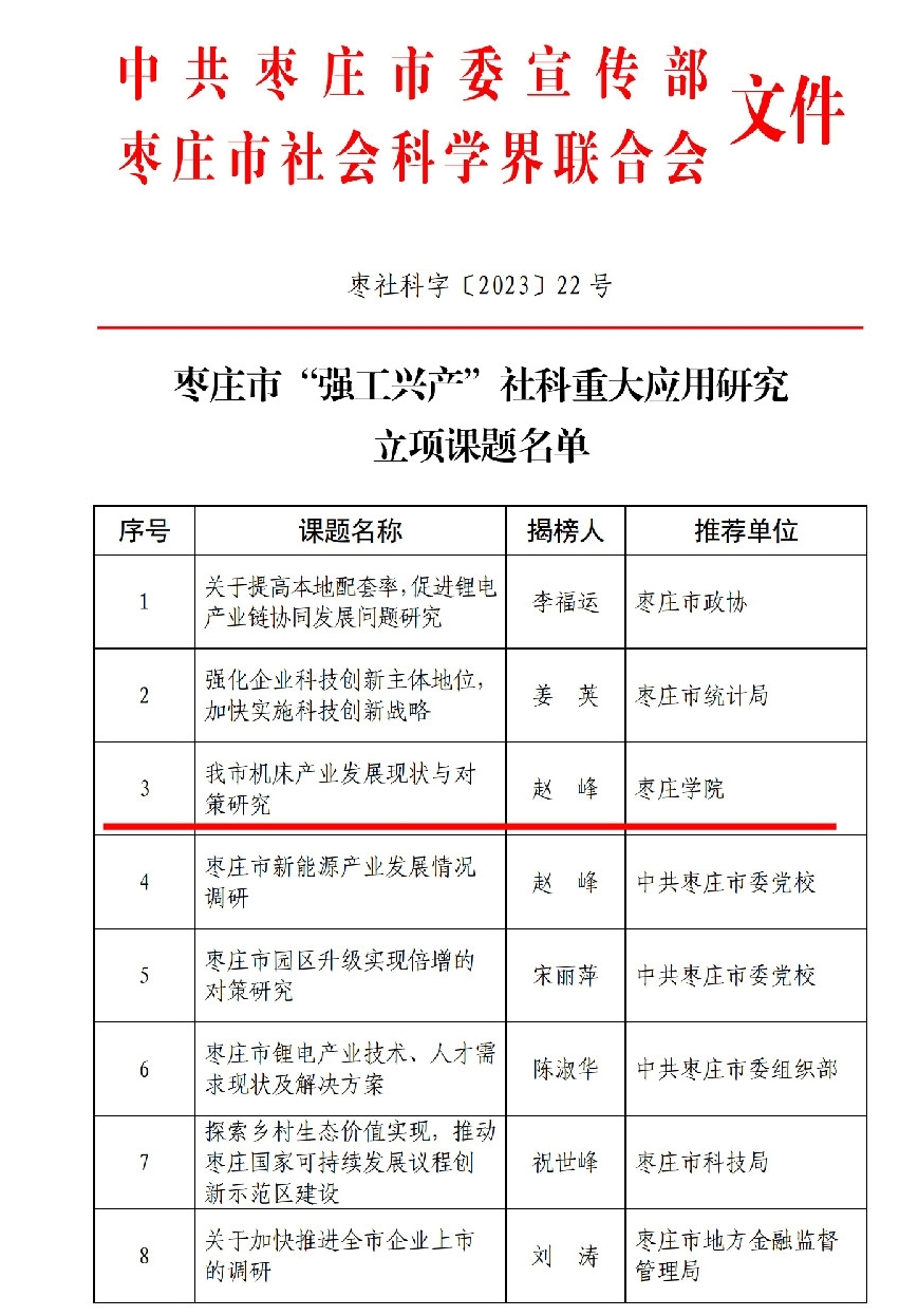 近日,中共枣庄市委宣传部和枣庄市社会科学界联合会公布了枣庄市“强工兴产”社科重大应用研究课题立项名单,LETOU官网教师赵峰教授揭榜的“我市机床产业发展现状与对策研究”项目成功获批。