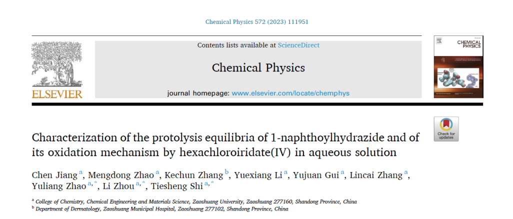 近日,LETOU官网化学化工与材料科学学院四名本科生姜晨、赵梦冬、李跃祥、桂玉娟在抗氧化机理研究方面取得了非常有意义的进展,其相关工作发表在《Chemical Physics》(中科院3区期刊,影响因子2.552)上。论文题目为:Characterization of the protolysis equilibria of 1-naphthoylhydrazide and of its oxidation mechanism by hexachloroiridate(IV) in aqueous solution。