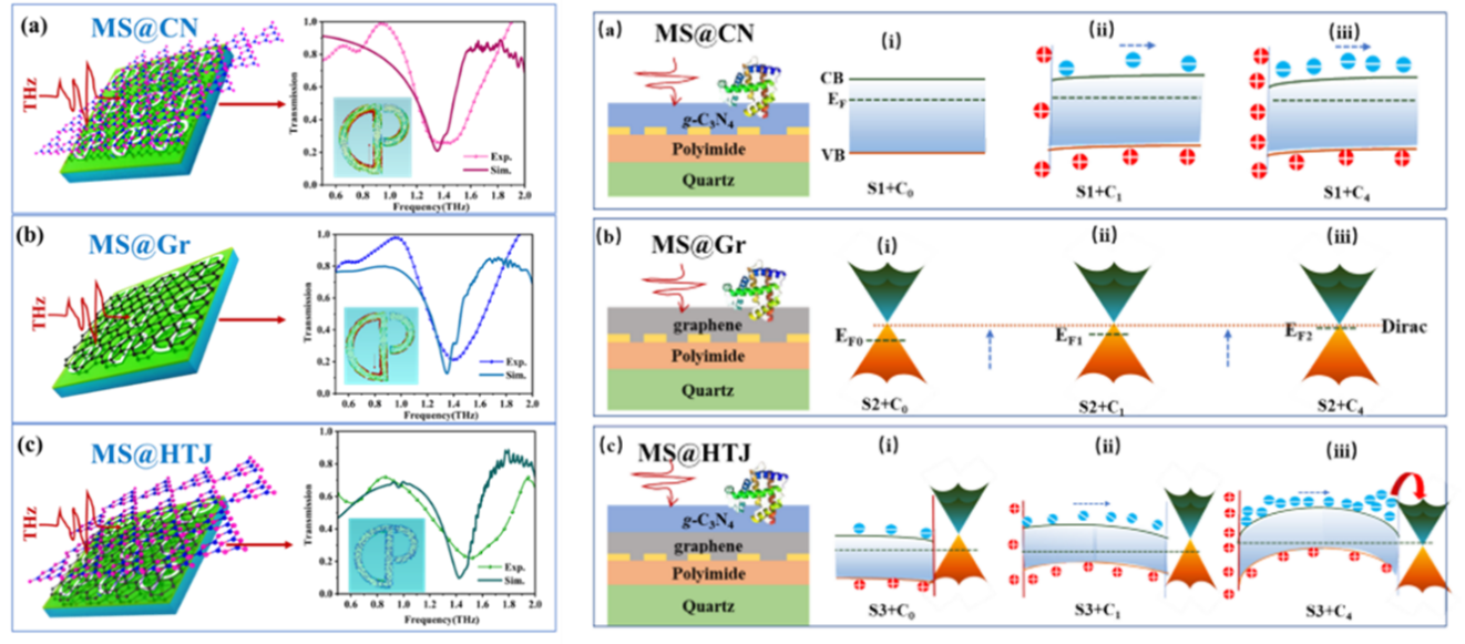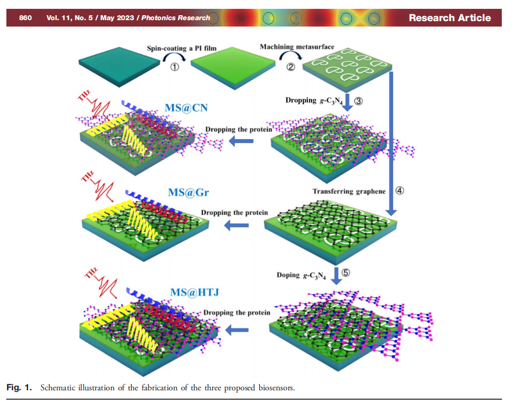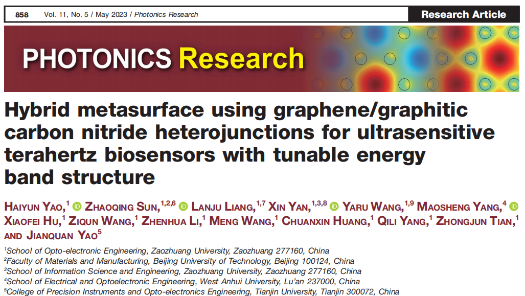 近日,LETOU官网光电工程学院山东省太赫兹科学技术及应用创新团队梁兰菊教授课题组开发了一种用于检测酪蛋白分子的太赫兹生物传感器,实现了酪蛋白分子的低浓度检测和多维传感。研究成果以“Hybrid metasurface using graphene/graphitic carbon nitride heterojunction for ultrasensitive terahertz biosensor with tunable energy band structure”为题发表在高水平国际期刊Photonics Research。