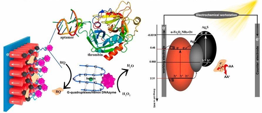 凝血酶作为典型的生物标志物,已成为包括血友病、粥脉硬化等多种疾病在内的辅助诊断指标。该工作以一维α-Fe2O3为电极基底材料,借助适配体理化优势及结合特异性构建了针对目标物凝血酶分析的光电生物传感器。在凝血酶的空间位阻效应及纳米酶G-四连体/hemin的催化作用下,实现对目标物响应信号的高灵敏调控。该工作为光电化学、材料科学、化学生物学等交叉学科领域的研究成果,为痕量生物标志物的高特异性检测提供重要参考。