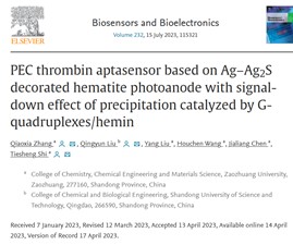 近日,化学化工与材料科学学院张巧霞博士和石铁生教授及其化学生物学创新团队,在功能性生物标志物的光电传感分析方面取得新进展,其相关工作发表在《Biosensors and Bioelectronics》(中科院1区Top期刊,影响因子12.545)上。论文题目为:PEC thrombin aptasensor based on Ag–Ag2S decorated hematite photoanode with signal-down effect of precipitation catalyzed by G-quadruplexes/hemin。