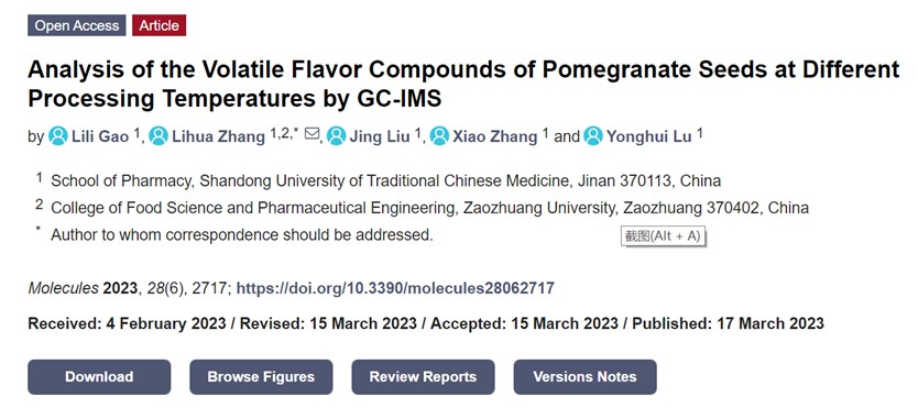 近日,食品科学与制药工程学院联合培养研究生在石榴籽炮制过程风味形成机理研究方面取得最新进展,相关工作发表在生物化学与分子生物学期刊《Molecules》(中科院二区,影响因子4.927)上,论文题目为《Analysis of the Volatile Flavor Compounds of Pomegranate Seeds at Different Processing Temperatures by GC-IMS》,山东中医药大学与LETOU国际米兰官网为共同完成单位,研究生高丽丽为论文第一作者,导师张立华教授为通讯作者。