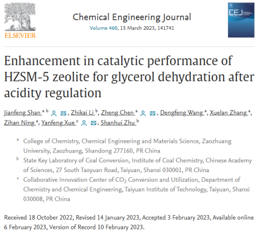 近日,化学化工与材料科学学院工业催化团队在甘油催化转化方面取得最新进展。相关工作发表在国际著名期刊《Chemical Engineering Journal》(中科院1区,TOP期刊,影响因子16.744)上,论文题目为“Enhancement in catalytic performance of HZSM-5 zeolite for glycerol dehydration after acidity regulation”。