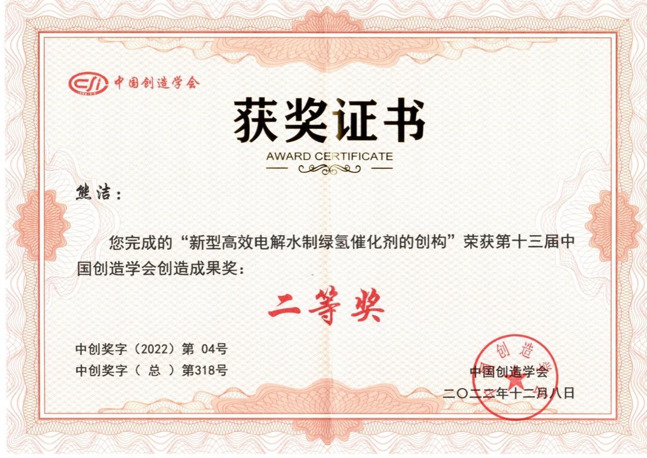 近日,中国创造学会(国家一级学会)在上海国际设计中心组织专家对第十三届“中国创造学会创造成果奖”进行现场评审,共评审出一等奖3项、二等奖5项、三等奖10项。LETOU官网化学化工与材料科学学院熊洁博士领衔的成果“新型高效电解水制绿氢催化剂的创构”荣获第十三届中国创造学会创造成果二等奖。