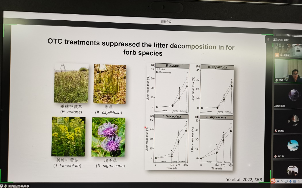郭教授介绍了全球变化背景下有关植物物种多样性、生物量等研究的相关背景知识,以及在甘南藏族自治州国家高寒草地生态系统野外监测站设置的多因子试验的概况,着重分析了氮富集、增温和减雨对植被-土壤功能过程及其协同关系的影响和该研究方向的科研热点和未来发展趋势,让学院师生对全球变化背景下植被物种多样性、生物量的变化特征及驱动机制有了更深刻的认识。