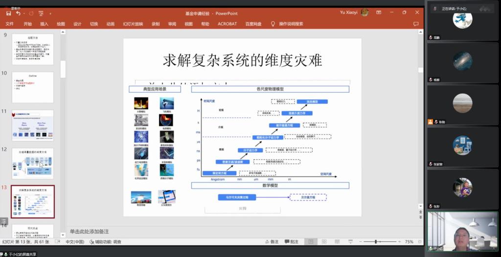 于教授从基金选题、人工智能方向选题探讨、申请书撰写和结论等四个方面作了细致讲解。于教授强调基金选题要面向国家的应用需求,以创新性的点去推动国家重大战略的实施,人工智能方向选题注重学科交叉,重点解决发现基本原理和应用基本原理的过程中的维数灾难问题。于教授还根据自己的研究方向和内容对人工智能学科交叉领域凝练科学问题和基金撰写的主要问题进行了深入讲解。交流环节,青年教师与于教授就基金申请的关键问题进行了深入探讨。