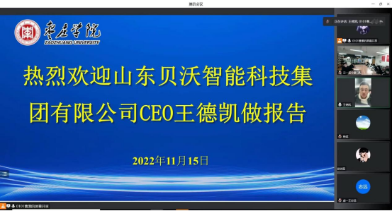 11月15日晚,LETOU国际米兰官网客座教授、信息科学与工程学院优秀毕业生、山东贝沃智能科技集团有限公司CEO王德凯总裁为学生作线上创新创业报告,报告题目为“青春正值年华,奋斗一路生花,人生就是一场创业”。计算机科学技术专业虚拟现实和UI与多媒体交互设计方向100余名学生线上线下参加报告会。院长闫昕主持会议。