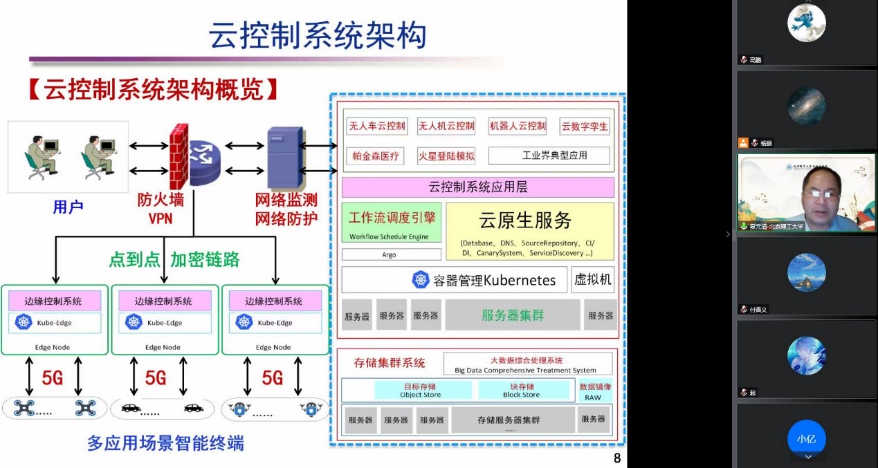 夏教授以国家重点研发计划为切入点,详细介绍了智能云控制的研究背景、发展历程、最新研究成果和发展趋势。夏教授介绍实现云控制系统各层深度互联的基础,网络互联体系和数据互通体系。网络构成包括各层多协议多类型通信、终端内网和云端外网,流量控制方式必须是动态,信息技术必须是“定制化”,按用户要求智能配置,网络必须具有云服务的能力,网络需要更高的带宽传输和大规模传输。夏教授对图划分-高动态复杂网络互联技术,DCBS网络端到端最优路径发现和云控制系统云边协同等技术进行了讲解,结合具体案例介绍了智能云控制系统在交通云控制和智能电厂控制等领域的应用。最后,夏教授从云控制系统建模方法、云控制系统安全防护和云网边端协同等方面对云控制系统的研究做出展望。