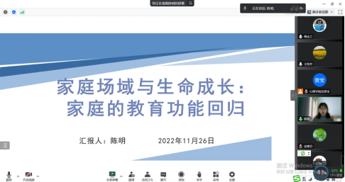 陈明博士的报告题目为《家庭场域与生命成长:家庭的教育功能回归》,她从场域理论的角度提出家庭是一个良性互动的生态圈,家庭教育不仅属于呱呱坠地的孩子,也属于任何一个正在成长的成年人,不仅父母会对孩子产生影响,孩子也会对父母“文化反哺”,家庭成员要共同激活家庭的文化资本。最后,她分享了成果发表的过程和感受。