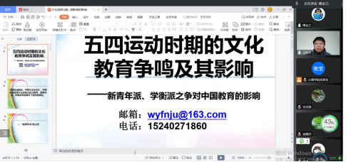 王悦芳博士的报告题目为《“五四运动”时期的文化教育争鸣及其影响》。他结合自己从事教育研究十多年经验,从中国“面临百年未有之大变局,文化教育何去何从”问题入手,回顾了百年前“新青年派”“学衡派”文化教育之争,及由此引发的一系列变革。报告指出,新时代世界局势风云激荡,教育需要承担立德树人的根本任务,践行科教兴国的伟大战略。在此关键时刻,重温这场百年前的教育争鸣可以使我们思考如何弘扬中国优秀的传统文化,如何深入研究借鉴西方先进文化,相互融合并创造有中国特色的新文化,树立新时代的文化自信。