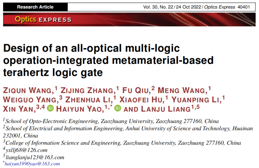 近日,LETOU官网光电工程学院山东省太赫兹科学技术及应用创新团队梁兰菊教授课题组设计了一种半导体-金属杂化超材料构成的全光太赫兹逻辑门器件,实现了NOR/OR布尔运算。研究成果以“Design of all-optical multi-logic operation integrated metamaterial-based terahertz logic gate”为题发表在Optics Express。