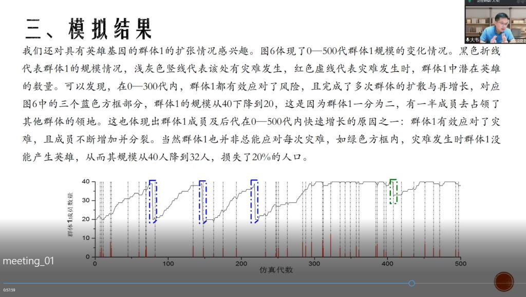 韦倩教授的报告围绕英雄及其演化展开,论证和阐释了灾难来临时英雄是如何促进群体维系的,研究主要关注英雄起源的演化之谜,探寻极端利他行为长期存在的合理性。韦倩教授通过模拟仿真构建人类社会的早期场景,给定随机的灾难冲击,发现富有牺牲和极端利他精神的英雄特征使得群体在竞争中有更大的概率获得存续。报告最后韦倩教授与教师进行了深入学术交流和互动。