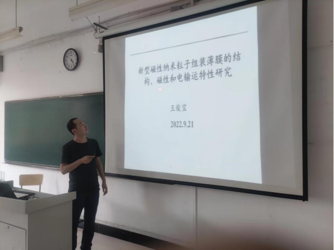 王俊宝博士做了题为《新型磁性纳米粒子组装薄膜的结构、磁性和电输运特性研究》的学术报告,报告从研究背景、研究内容与方法、实验结果与分析、主要结论四个方面介绍了新型磁性纳米粒子组装薄膜的制备、结构、磁性和电输运特性。王俊宝博士对Fe65Co35@Ni0.5Zn0.5Fe2O4纳米复合薄膜开展了一些具有特色的系统性、探索性研究,为该类材料的开发和应用提供了实验和理论依据,并以新的颗粒膜制备方法和调控手段为切入点,制备出了有别于传统颗粒膜的新型Fe、Co纳米粒子组装颗粒膜,阐明了颗粒膜中各因素对反常霍尔效应的确切贡献,明确了各因素对增强反常霍尔效应的确切机理并建立了相应修正理论。