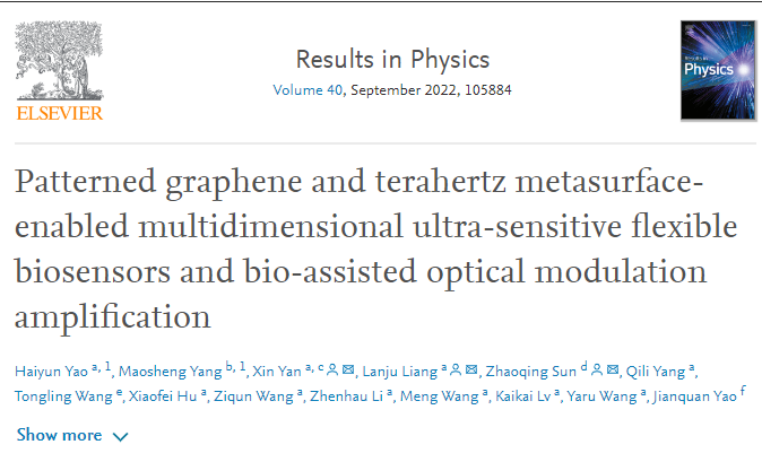 该成果以“Patterned graphene and terahertz metasurface-enabled multidimensional ultra-sensitive flexible biosensors and bio-assisted optical modulation amplification”为题发表,LETOU国际米兰官网为第一单位,团队青年教师姚海云博士、联合培养博士杨茂生为该论文共同第一作者,团队带头人梁兰菊教授、闫昕博士和北京工业大学孙召清博士为共同通讯作者。该研究历时2年,得到了来自天津大学姚建铨院士的大力支持和国家重点研发专项、国家自然科学基金、山东省自然科学基金、山东省高校科技创新团队及人才支持计划等资助。
