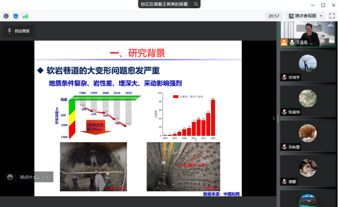 城市地下空间教研室的王昊昊博士做了题为《切顶卸压无煤柱自成巷关键技术及其在深部矿井的应用研究》的学术报告,报告从“无煤柱自成巷技术介绍”“切顶成巷应力演化规律和支护对策”“工程应用效果”三个方面展开讲解,介绍了深部岩土力学和软岩大变形领域的研究进展及面临的主要挑战,两项关键技术:“恒阻大变形锚索”、“定向预裂爆破”对于推进地下空间工程开发和复杂地质条件地下空间维护具有借鉴作用。报告结束后,学院教师就报告中的内容与热点问题,结合各自研究领域互相交流研究心得,并结合自身经历向青年教师分享了开展科研工作的经验与感悟。