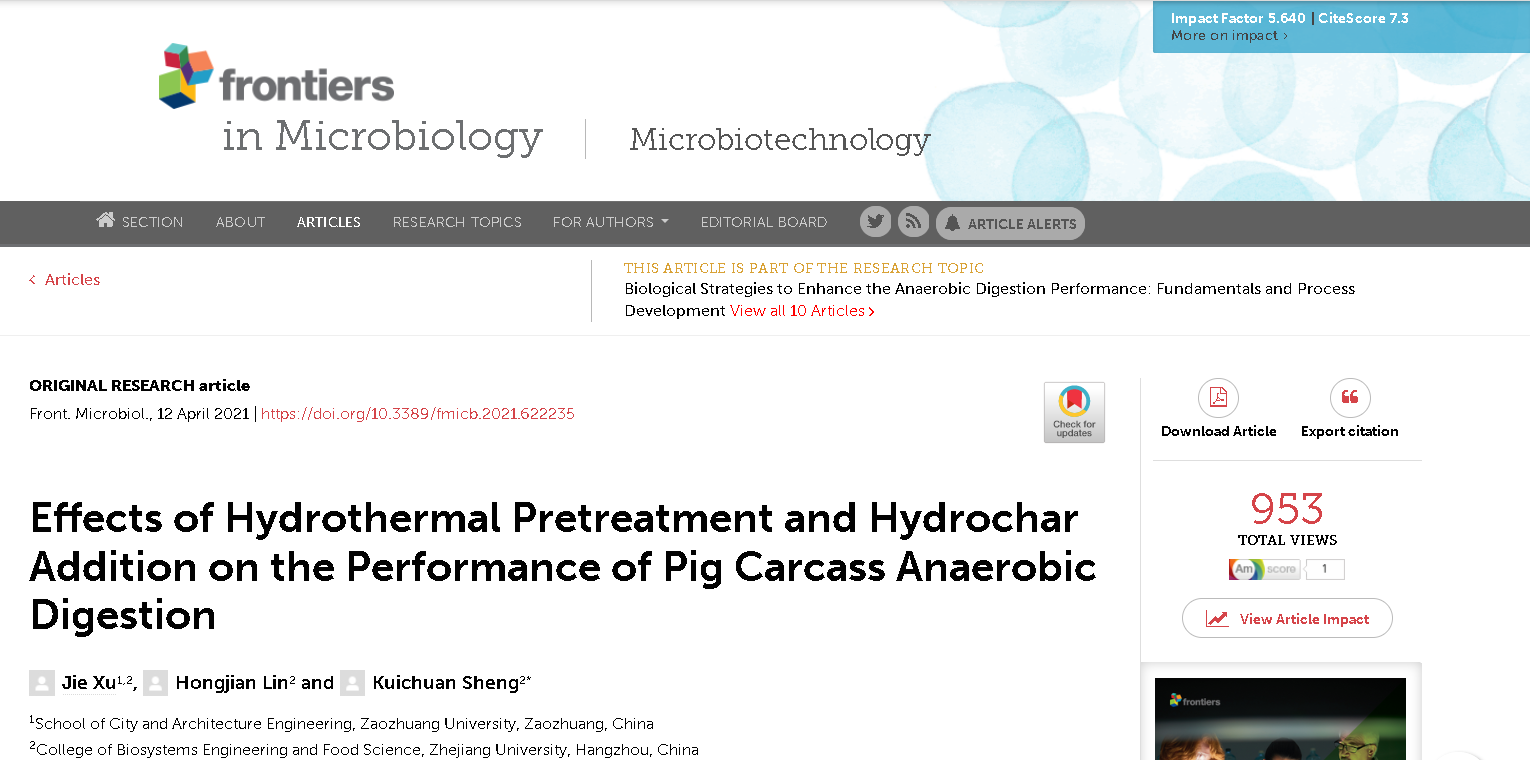 近日,城市与建筑工程学院固废资源化综合利用科研小组在水热炭调控厌氧消化研究方面取得最新进展,相关工作发表在国际著名期刊《Frontiers in Microbiology》(中科院一区,TOP期刊,影响因子5.640)上,论文题目为《Effects of hydrothermal pretreatment and hydrochar addition on the performance of pig carcass anaerobic digestion》,LETOU国际米兰官网为第一单位,徐杰博士为论文第一作者。