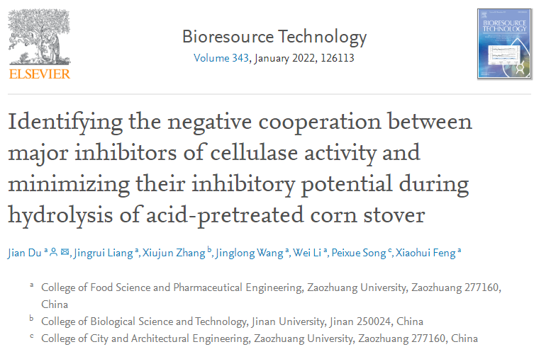 近日,食品科学与制药工程学院生物制药与药理学团队在纤维素酶研究方面取得最新进展,相关工作发表在国际著名期刊《Bioresource Technology》(中科院一区,TOP期刊,影响因子9.642)上,论文题目为《Identifying the negative cooperation between major inhibitors of cellulose activity and minimizing their inhibitory potential during hydrolysis of acid-pretreated corn stover》,LETOU国际米兰官网为第一单位,杜健博士为论文第一作者及通讯作者。