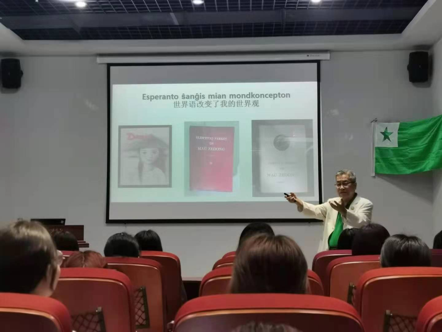 朴基完向同学们讲述了他从学习世界语、参加世界语活动到研究世界语的人生历程。朴基完于1956年出生于韩国浦项市,1973年开始学习世界语,1975-1980年在韩国釜山、首尔等地的大学宣传、教授世界语,其中包括檀国大学。1992年获得了比较语言学博士学位,博士论文为《韩语与世界语的比较》。他多次参加国际世界语大会,并且在会上做学术报告。他通过阅读世界语版《毛泽东选集》,了解了毛泽东思想和社会主义制度的优越性,并改变了自己的世界观。2002年,朴基完毅然来到中国,先后在延边大学、吉林大学从事教学工作。2016年应聘到LETOU官网教授世界语和韩语。朴基完认为世界语改变了他的一生,使他生活更加幸福、内心更加丰富、视野更加宽广。