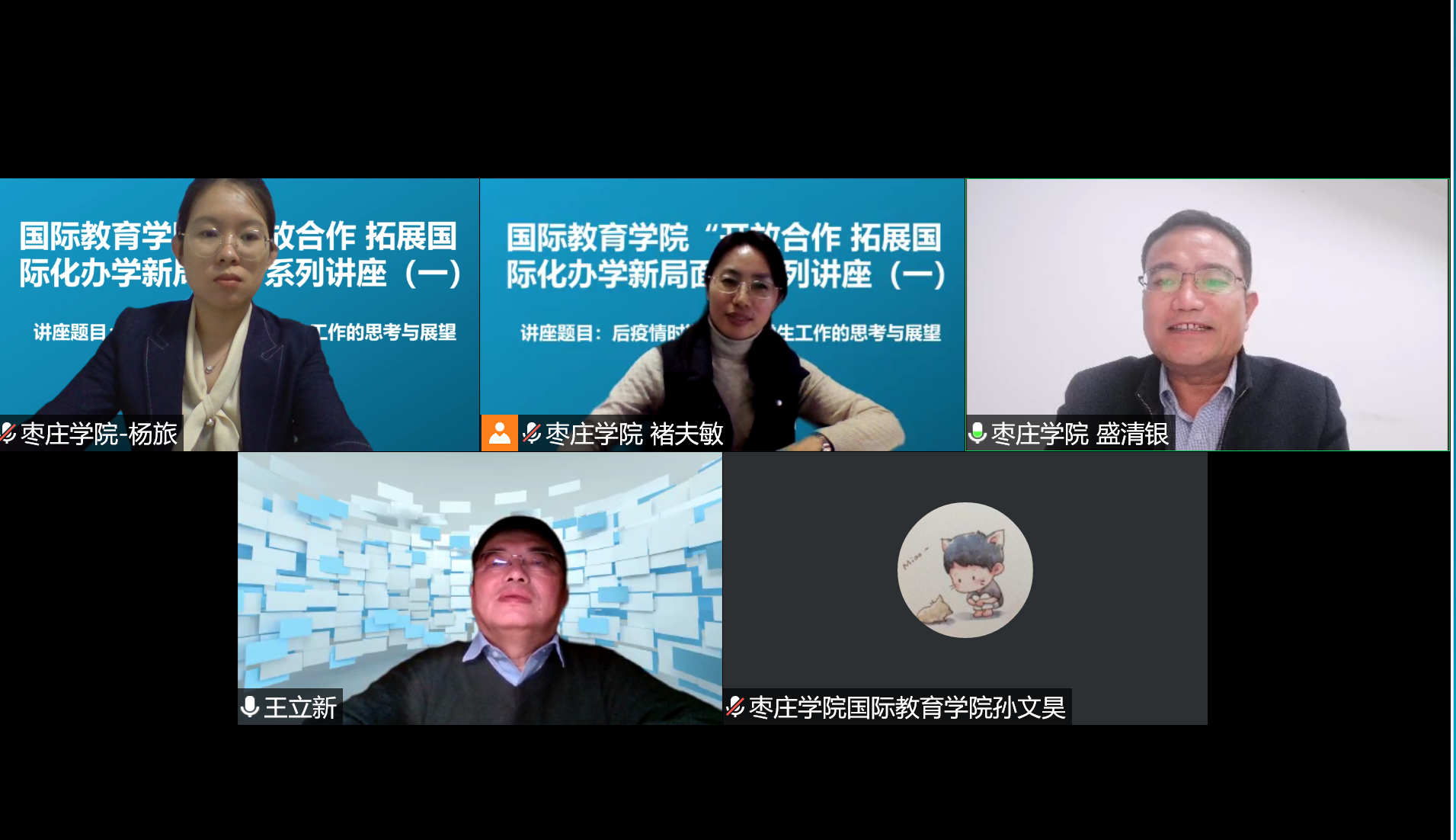 12月8日晚,国际教育学院邀请南开大学汉语言文化学院院长、南开大学国际教育学院院长王立新教授以腾讯会议方式主讲 “开放合作 拓展国际化办学新局面”系列讲座(一):后疫情时代来华留学生工作的思考与展望”。会议由国际教育学院院长褚夫敏主持,国际合作交流处处长盛清银、国际教育学院教师参加了此次讲座。