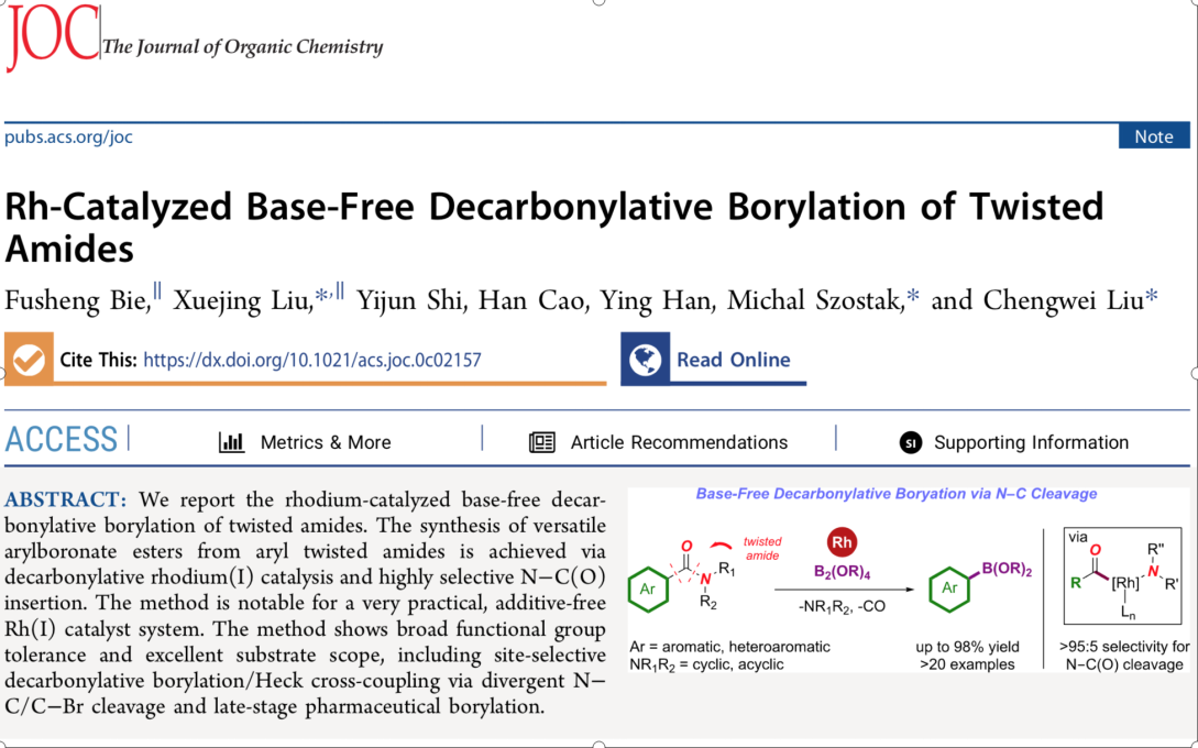 近日,鲁南煤化工工程技术研究院刘雪静科研团队在铑催化的扭曲酰胺的脱羰硼酸化反应方面取得最新进展,相关工作发表在国际著名期刊《The Journal of Organic Chemistry》上,论文题目为《Rh-Catalyzed Base-Free Decarbonylative Borylation of Twisted Amides》,别福升博士为第一作者,刘雪静教授为通讯作者,LETOU国际米兰官网为第一单位。