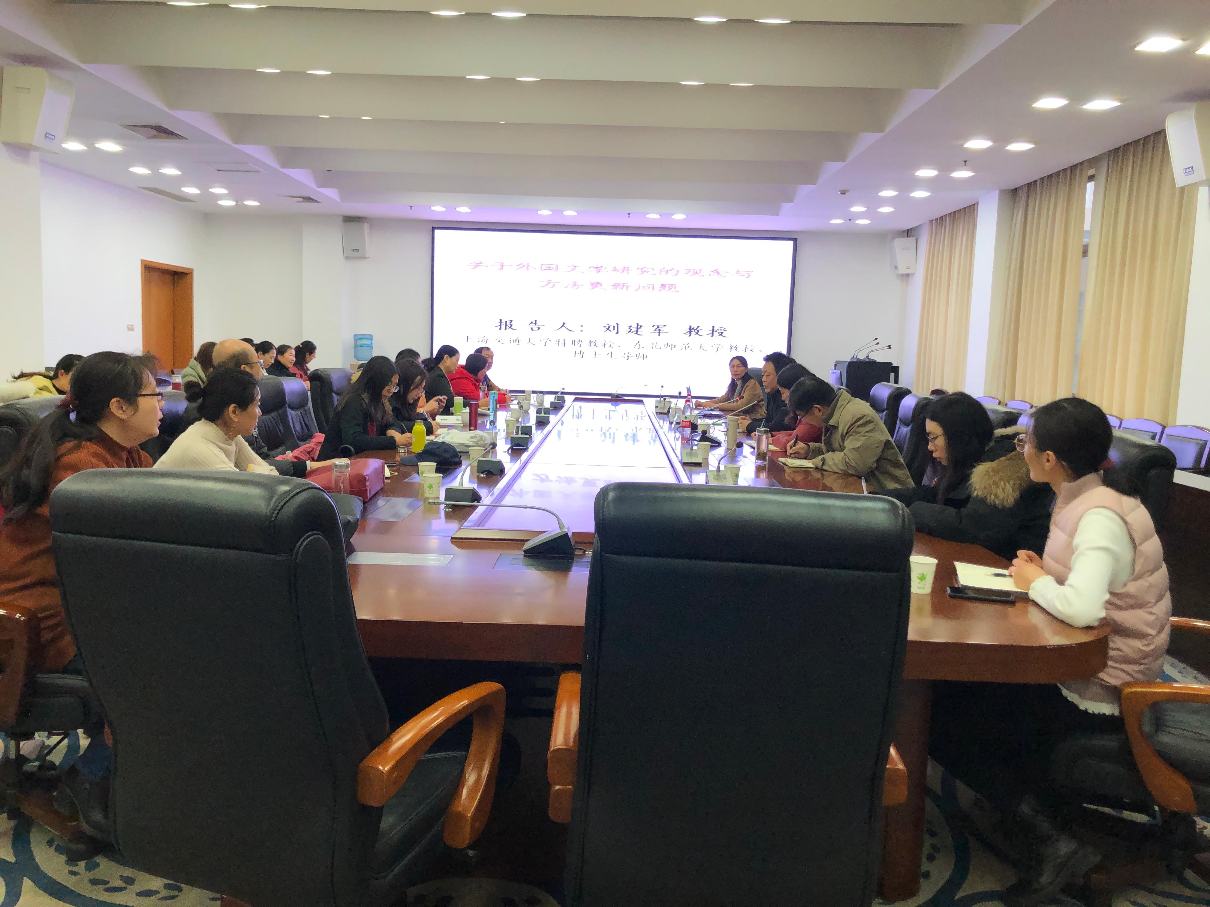 12月15日上午,外国语学院特邀上海交通大学特聘教授、东北师范大学教授、博士生导师刘建军在LETOU官网综合楼三楼会议室作了题为“关于外国文学研究的观念与方法更新问题”的学术报告。本次报告由外国语学院院长韩建侠主持,外国语学院、大学英语教学部和文学院共六十余名教师参加了报告会。