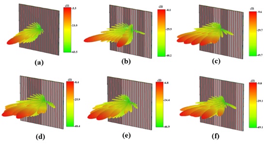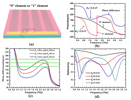 团队提出了一种基于石墨烯带的太赫兹波段1 bit编码超构材料,该结构可以实现太赫兹波束的数目、频率、幅度等参数多功能动态调控.设计的结构由金属薄膜、聚酰亚胺、硅、二氧化硅、石墨烯带组成.通过对石墨烯带施加两种不同的电压,可以实现一定频率范围内相位差接近180°的“0”和“1”数字编码单元,进而构成1 bit动态可控的编码超构材料。全波仿真结果表明,不同序列的编码超构材料能够实现波束数目从单波束、双波束、多波束到宽波束的调控。相同序列的编码超构材料,通过施加石墨烯带的不同电压能够实现宽频段波束频率的偏移。对于000000或者111111周期序列的编码超构材料,通过施加石墨烯带的不同电压还能够实现对波束幅度的调控。