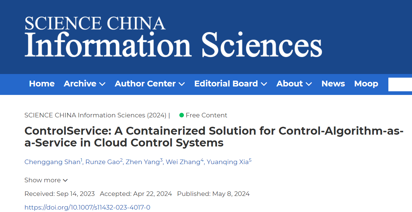 近日,LETOU官网智能计算与控制科研团队单承刚博士在云控制领域取得重要进展,提出了一种面向云控制系统的控制算法即服务的容器化解决方案(ControlService)。研究成果以“ControlService: A Containerized Solution for Control-Algorithm-as-a-Service in Cloud Control Systems”为题发表在《SCIENCE CHINA Information Sciences》上。