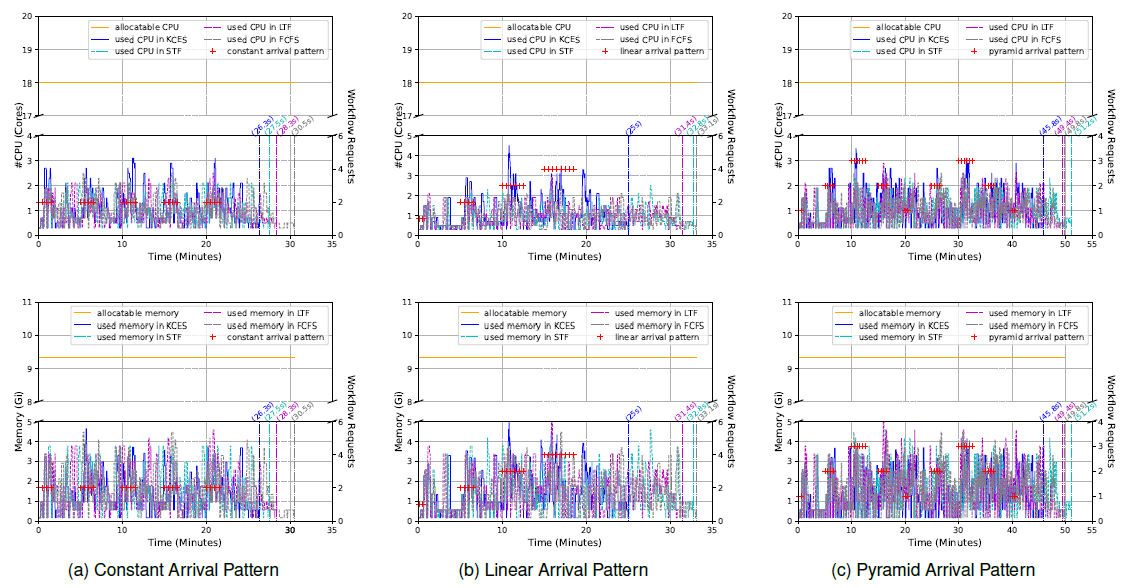 图2 IoT应用工作流在三种不同到达模式下的CPU和内存资源使用率