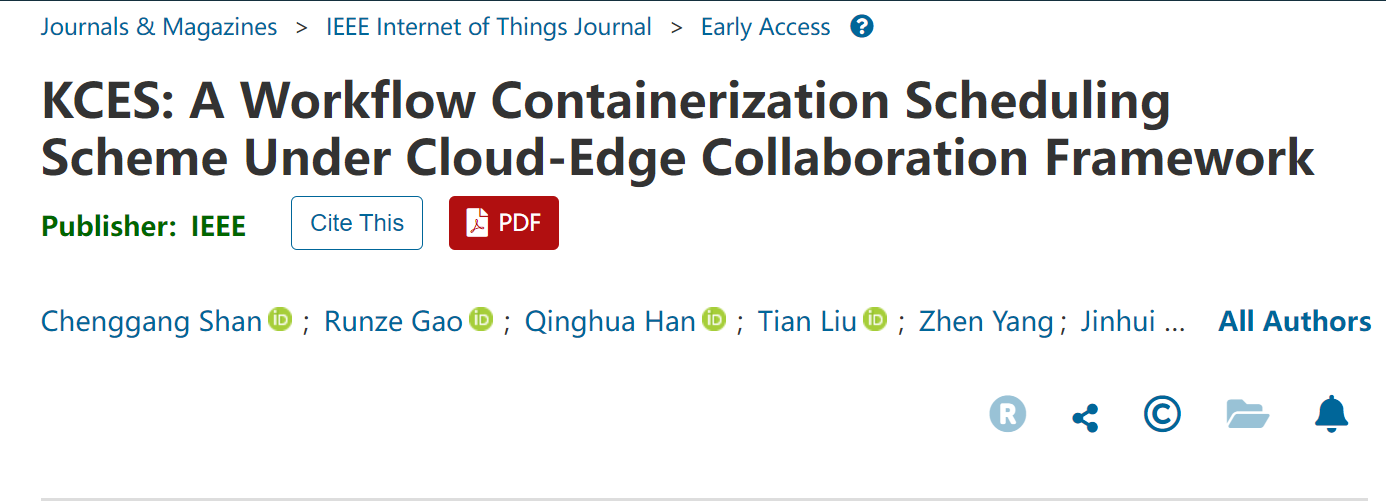 近日,信息科学与工程学院(人工智能学院)智能计算与控制科研团队单承刚博士在云边协同领域取得最新进展,相关成果发表在物联网领域国际著名期刊《IEEE Internet of Things Journal》(中科院1区,TOP期刊,影响因子8.2)上,论文题目为“KCES: A Workflow Containerization Scheduling Scheme Under Cloud-Edge Collaboration Framework”。