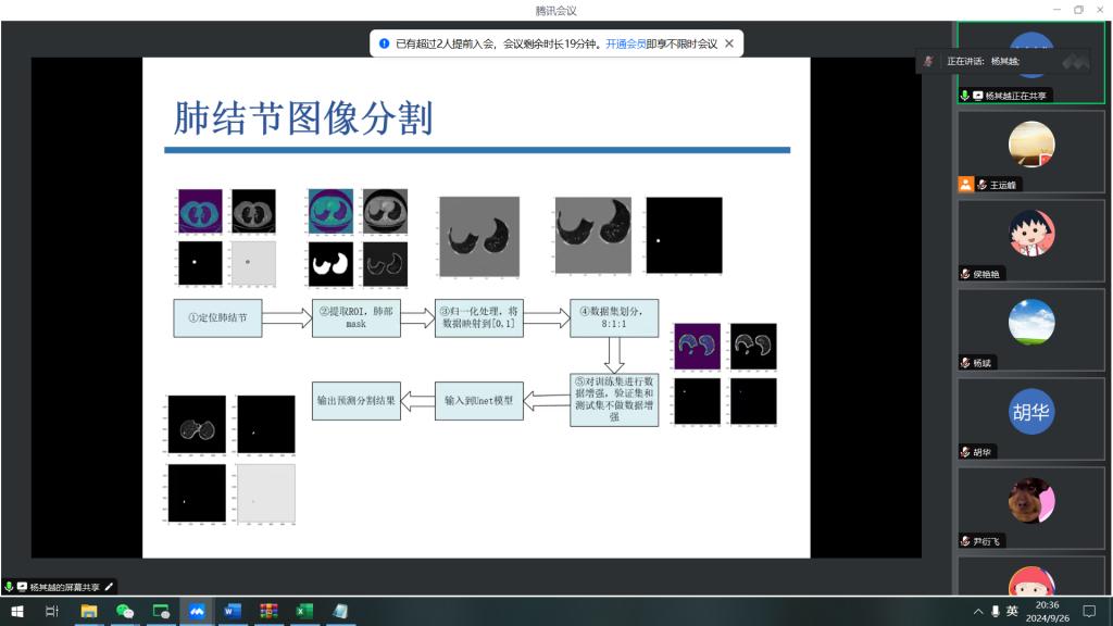 杨其越老师作了题为《基于深度学习的医学图像分割方法》的学术报告。报告针对医学图像复杂性、数据集稀缺等问题,介绍了基于深度学习的常用医学图像分割方法,并基于U-Net图像分割算法模型,构建了针对CT图像中肺结节分割的深度学习算法。实验结果表明,模型分割能力较高,且一定程度地降低了资源开销。