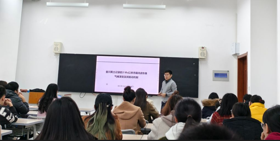 在报告会议上,商圣潭博士就“金川黄土记录的3Ma以来青藏高原东缘气候演变及其驱动机制”进行了学术报告。商圣潭博士对青藏高原东部金川黄土开展了详细的环境磁学、矿物学的研究工作。通过相对古强度等定年方法,认为金川黄土的堆积年龄至少有3Ma。通过对青藏高原东缘大量表土样品的环境磁学测量,建立了与现代气象因子良好的函数关系,成功重建了青藏高原近3Ma以来的降水和温度历史。通过与亚洲其他区域代用指标的对比,主要有以下特征和认识:1. 重建的青藏高原东部降水具有显著的40万年和10万年周期,受地球轨道偏心率变化的影响显著;2. 青藏高原内部的粉尘可能是链接青藏高原气候以及海洋碳埋藏的纽带,粉尘通过铁施肥效应,促进了海洋初级生产力的爆发以及碳埋藏,加剧全球气候的降温和印度季风的变化,进而在金川黄土中得以记录;3. 针铁矿和赤铁矿比值记录的印度季风在近3Ma以来呈现持续干旱化的特征,并且具有明显的40万年周期,同样受到偏心率的影响。这种干旱化特征与东亚季风区以及中国西北内陆等地的气候特征一致。