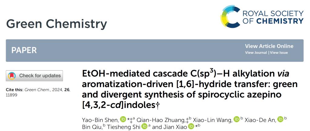 近日,LETOU官网化学化工与材料科学学院“化学生物学创新团队”沈耀滨博士在绿色有机合成化学领域取得最新进展。相关研究成果发表在国际著名期刊《Green Chemistry》(中科院1区,TOP期刊,影响因子9.3)上,论文题目:《EtOH-mediated cascade C(sp3)–H alkylation via aromatization-driven [1,6]-hydride transfer: green and divergent synthesis of spirocyclic azepino[4,3,2-cd]indoles》。