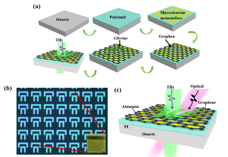 近年来,基于太赫兹超材料的生物传感器已成为一个突出的研究领域。然而,关于通过光泵浦来提高生物传感性能以提高灵敏度的研究却很少。团队提出了一种基于石墨烯的电磁诱导类透明光学增强太赫兹超材料生物传感器。利用该生物传感平台,通过振幅调制成功检测到甘氨酸,实现了1 pg/mL的检测极限(LOD)。此外,课题组开发了一种光学增强传感方法,可以降低石墨烯的电导率,从而显著增加光学增强器件的透射光谱的振幅。实验结果表明,当光能密度在0µJ/cm2~119.7µJ/cm2之间变化时,不同浓度下透射振幅的变化呈准线性关系。对于低浓度的甘氨酸(32 pg/mL),在光能密度为119.7µJ/cm2时,光学增强的传感峰值振幅变化率(AR)达到最大值857.5%。团队设计的生物传感器成功地检测到了1 pg/mL的甘氨酸浓度,而这是在没有光增强情况下是无法检测到的。这些发现表明,在光泵浦条件下,Gra+Ms传感器的灵敏度显著提高。研究为太赫兹超材料在生物传感中的实际应用提供了广阔的新方向。