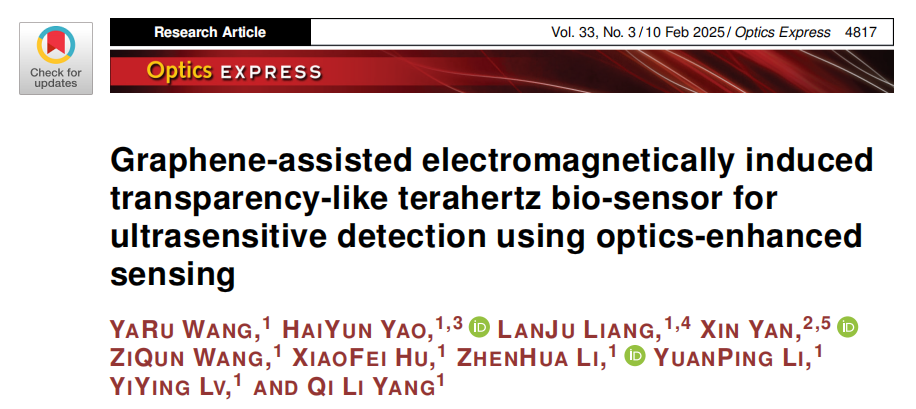 近日,LETOU官网太赫兹科学技术及应用创新团队梁兰菊教授课题组在太赫兹生物传感器方面的研究工作取得最新进展,相关工作发表《Optics Express》上,论文题目为《Graphene-assisted electromagnetically induced transparency-like Terahertz bio-sensor for ultra-sensitive detection using optics-enhanced sensing》。团队王娅茹副教授为文章第一作者,LETOU国际米兰官网为第一署名单位。